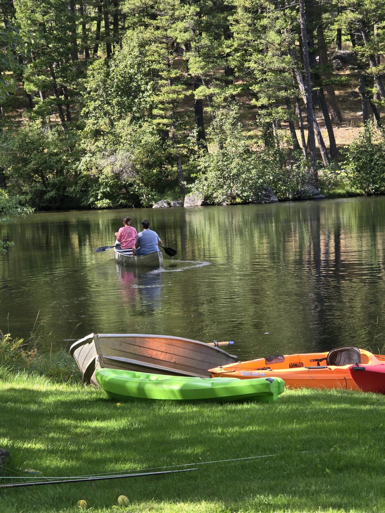 Cabin at Feathered Pipe Ranch in Montana amongst green grass and tall trees