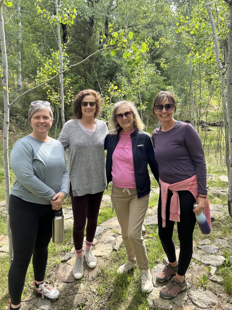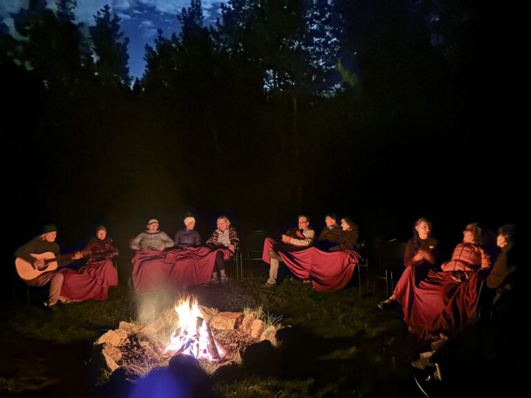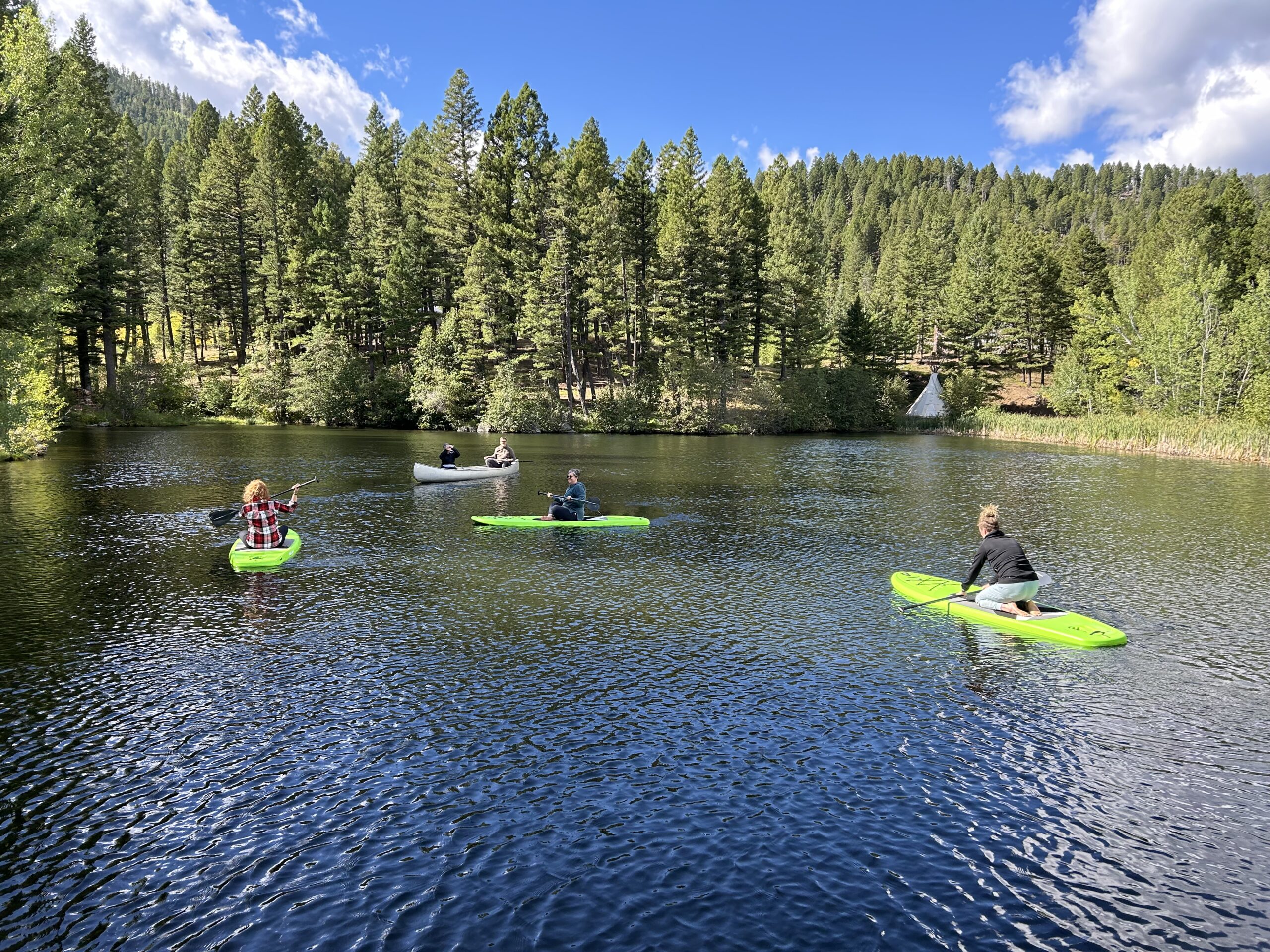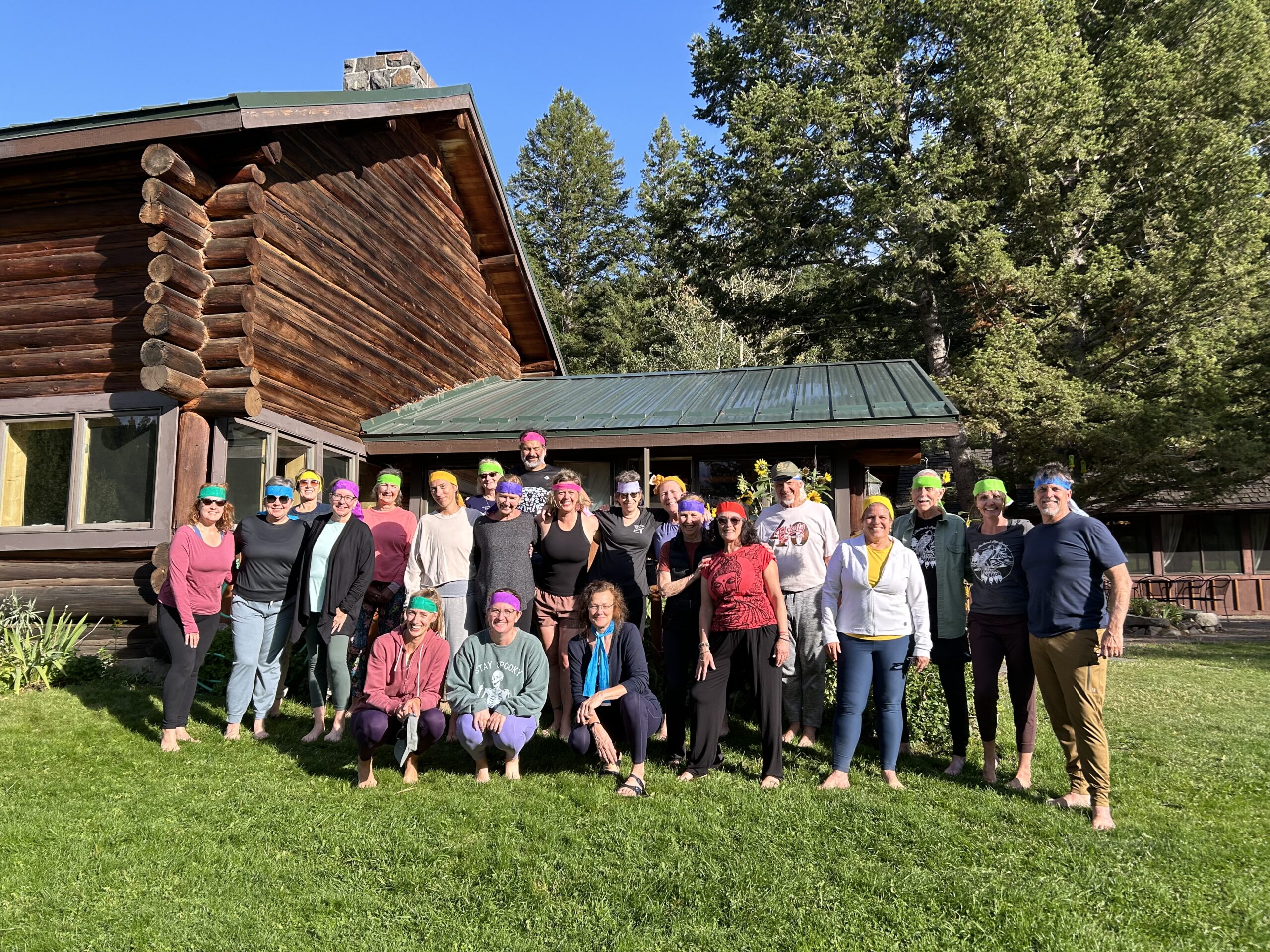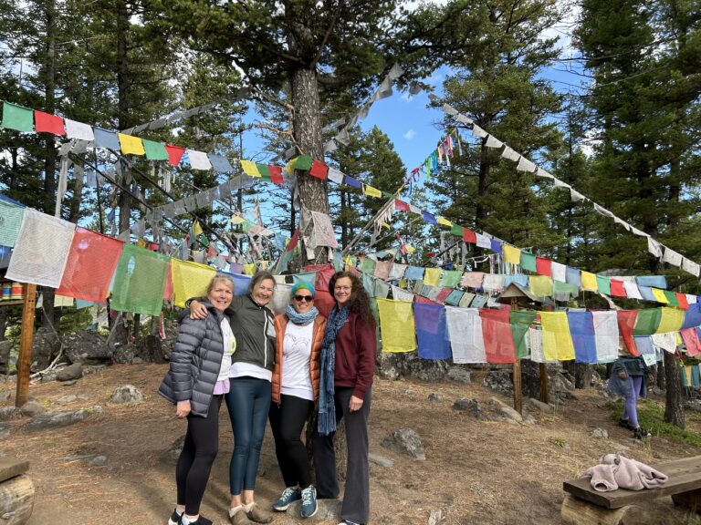 Stacy and Teresa seated cross legged, meditating on the yoga deck at Feathered Pipe Ranch